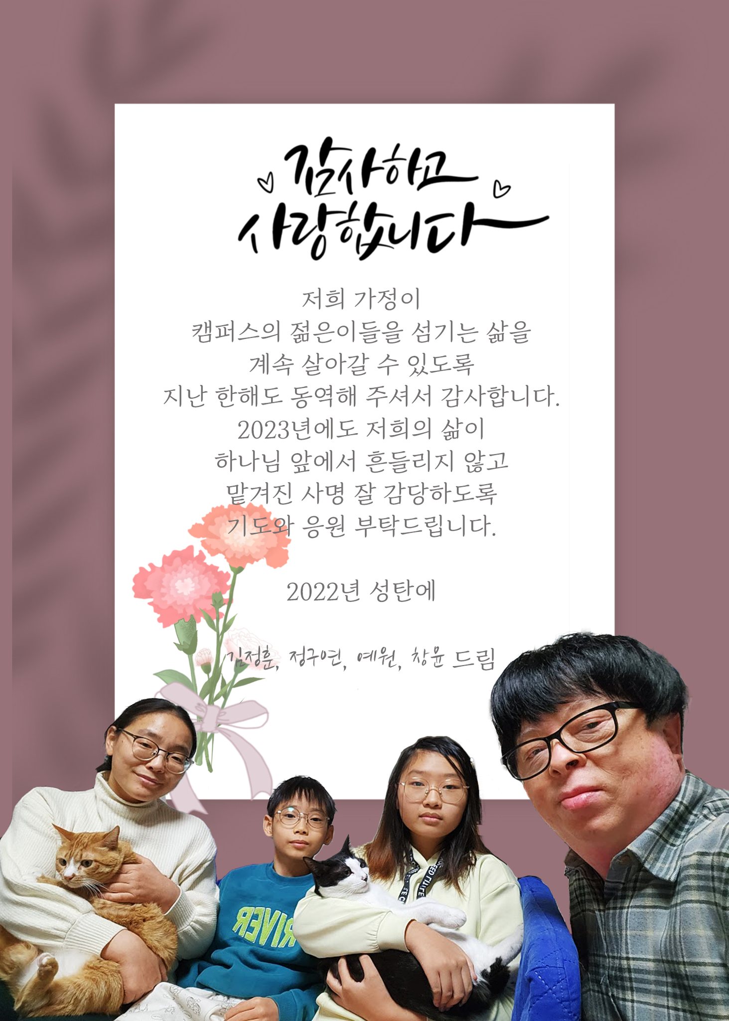 저희 가족 모두 지난 한 해, 특별히 아픈 일 없이 어려움업이 지났음에 감사합니다. 연말에 후원자들께 감사카드와 탁상달력을 발송하면서 이렇게 많은 분들이 저희 가정을 지지해 주고 계시다는 사실을 다시 한 번 확인하며 감사한 마음이 가득했습니다.