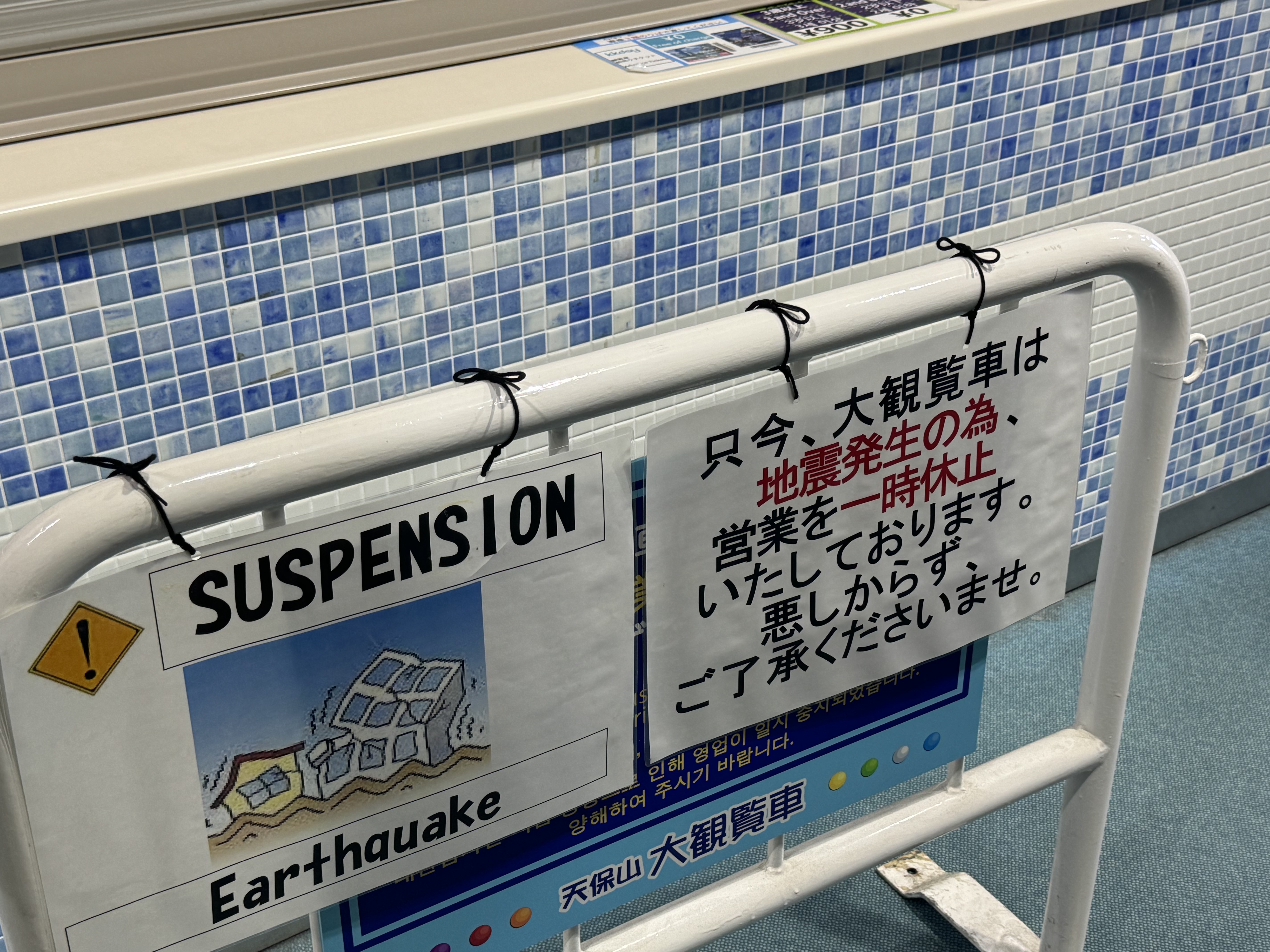 아쿠아리움을 나와서 바로 옆에 있는 대관람차를 타고 오사카 시내를 한 눈에 내려다 볼 예정이었다. 그런데 티켓팅을 하려고 가보니 매표소 문이 닫혀 있다. 1시간 전에 진도1짜리 지진이 발생해서 규정에 따라 운행하지 않는다는 것. 1시간 정도를 기다리면 운행될수도 있다고 직원이 안내해 주었지만 포기하고 이동하기로 했다.
