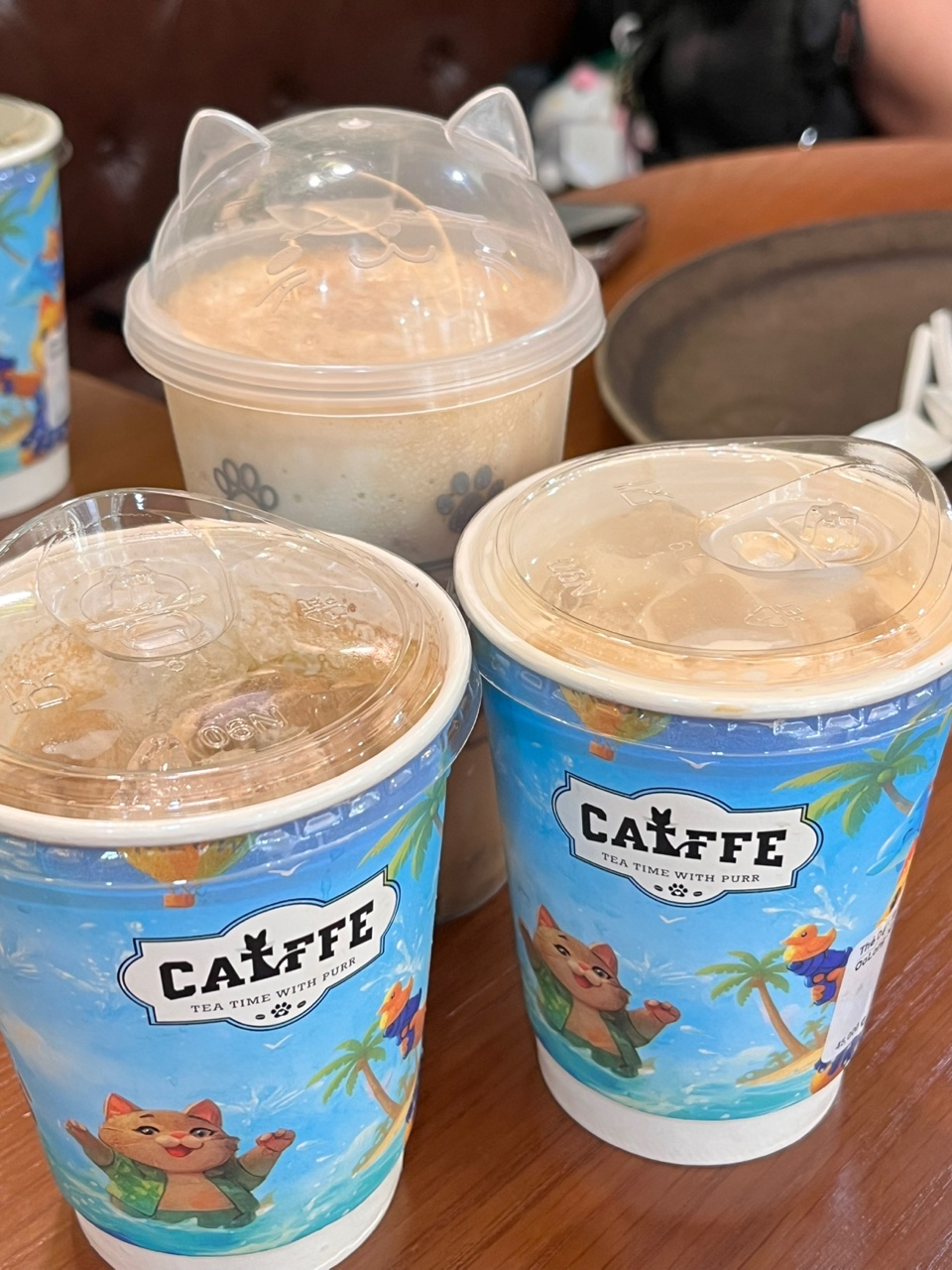 식사 후에는 근처 카페에 갔는데 모르고 들어갔는데 가고 보니 고양이 카페였음. 컵 뚜껑까지 고양이 모양으로 만든 컨셉에 충실한 재밌는 카페. 2층에 고양이들이 많이 있어서 멤버들이 즐겁게 놀았다.