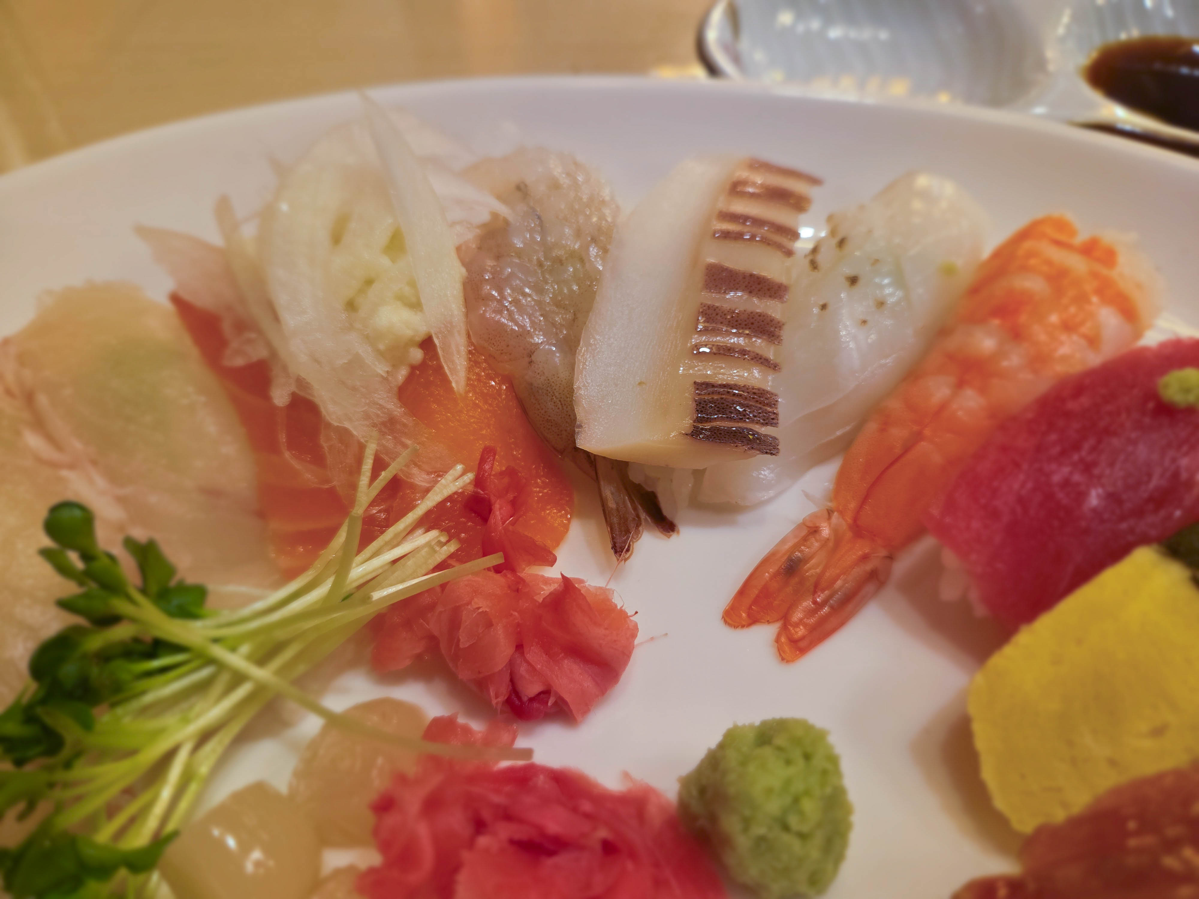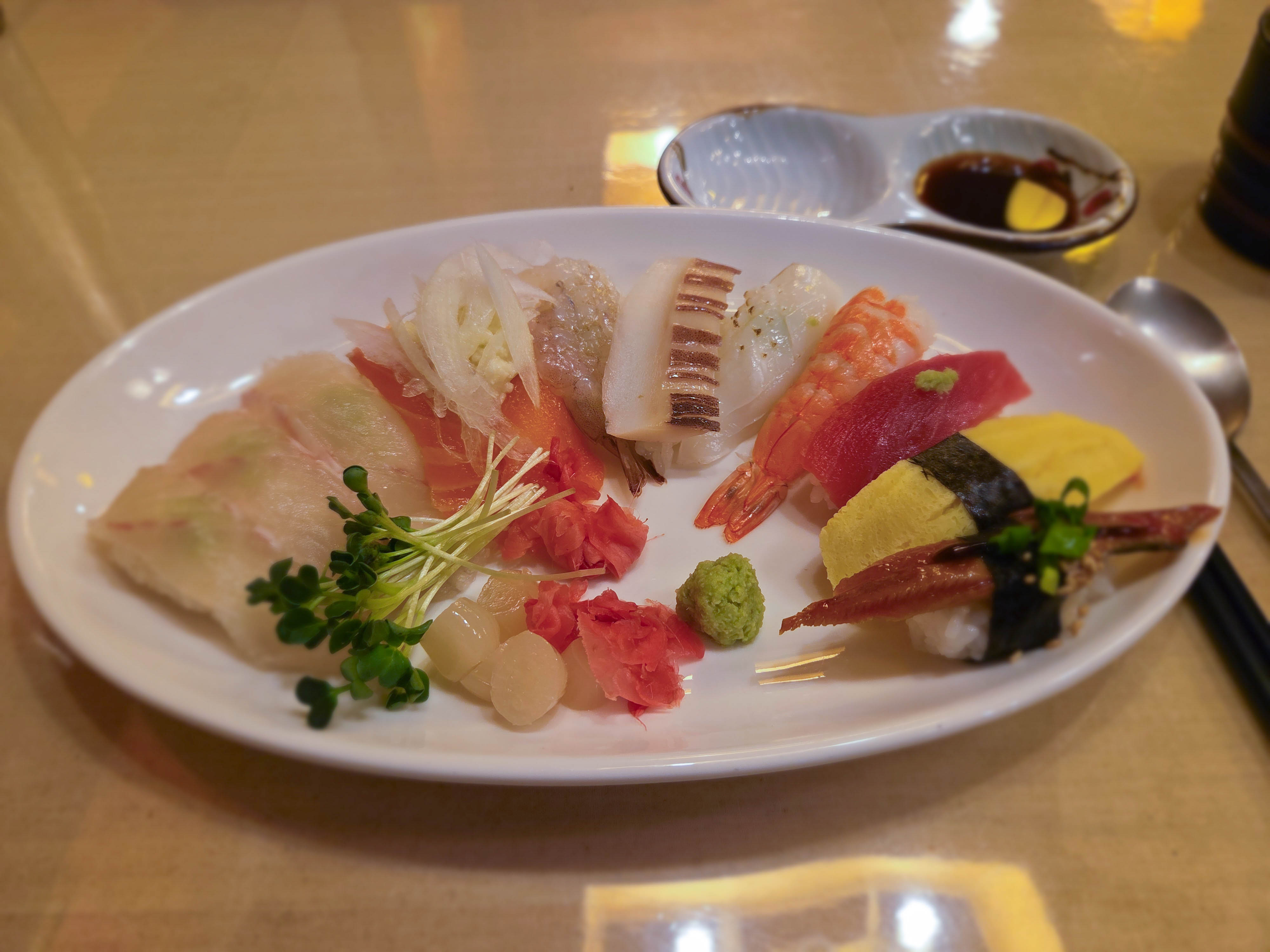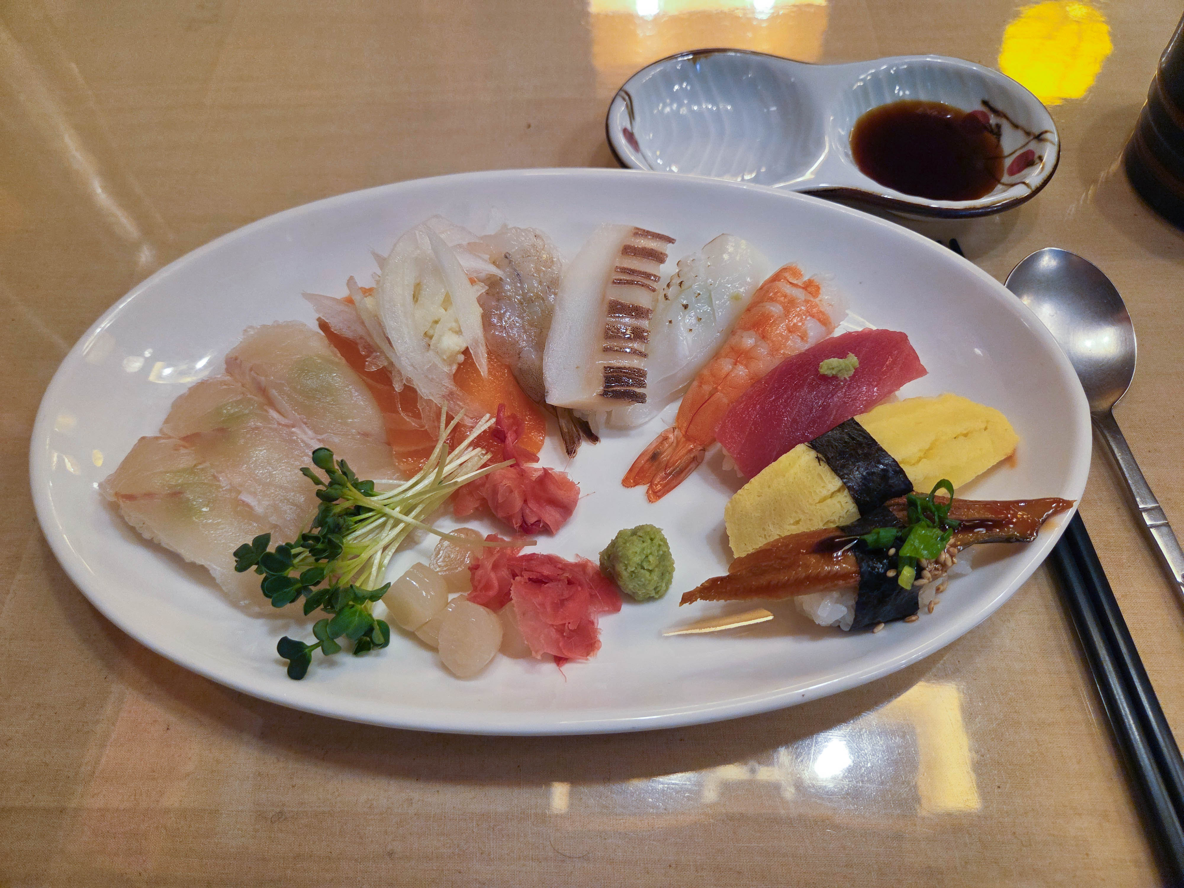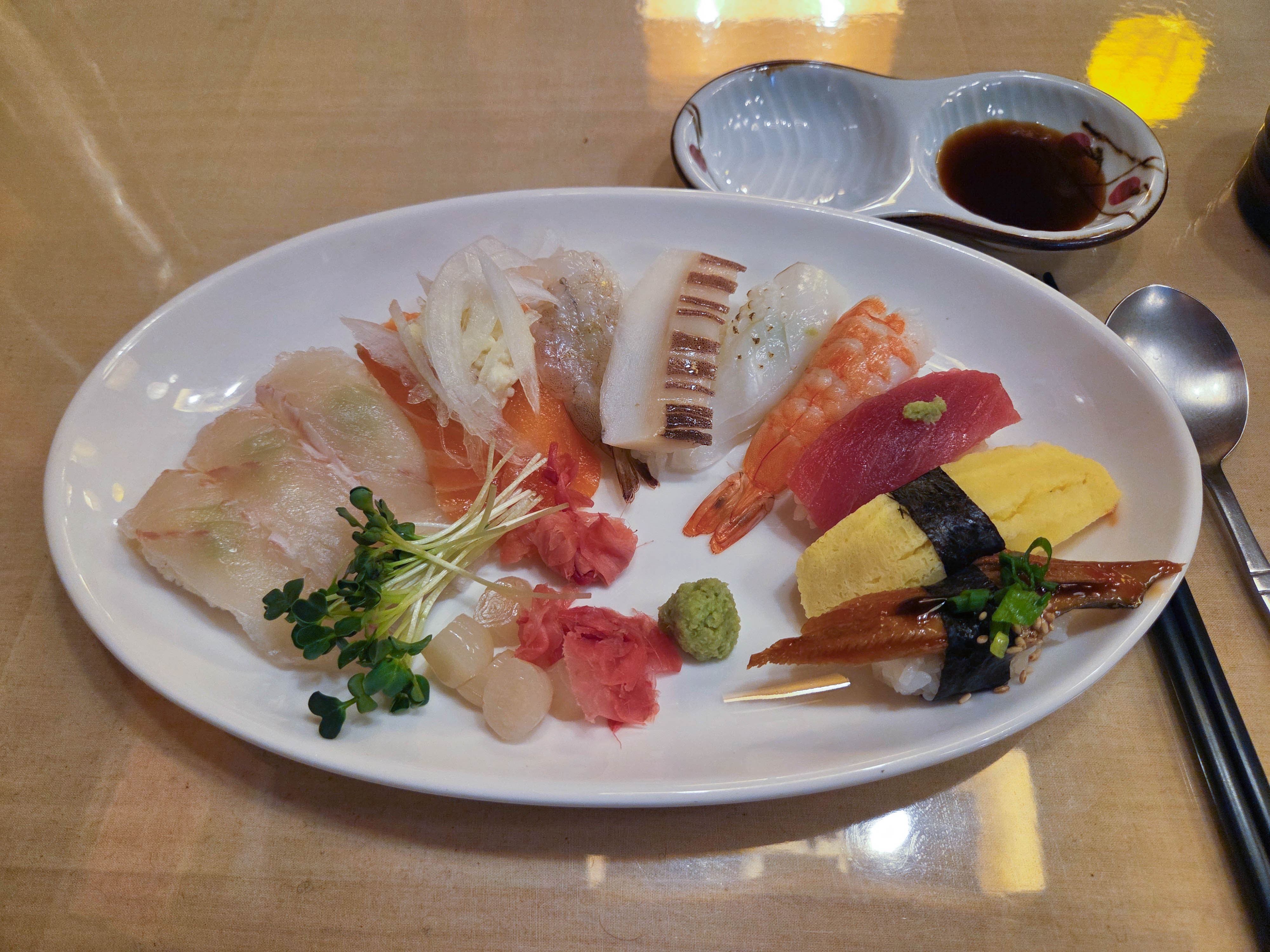 초밥 종류는 광어 3개, 연어 2개, 생새우 1개, 오징어 1개, 한치 1개, 새우 1개, 참치 1개, 계란 1개, 장어 1개 구성.